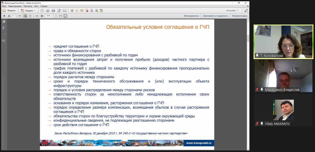 Сегодня, 21 сентября 2021 года, в онлайн-формате специалисты ТРАНСПРОЕКТ Групп провели обучающий семинар «Новое в законодательстве о ГЧП», для сотрудников органов государственного и местного управления. Данное мероприятие организовано в рамках программы ЕС и Республики Беларусь по развитию частного сектора, по заказу Группы Всемирного банка. Данный контракт продолжает многолетнюю совместную работу Группы Всемирного банка (World Bank Group) и ООО «ТРАНСПРОЕКТ Групп» по развитию государственно-частного партнерства в Республике Беларусь.