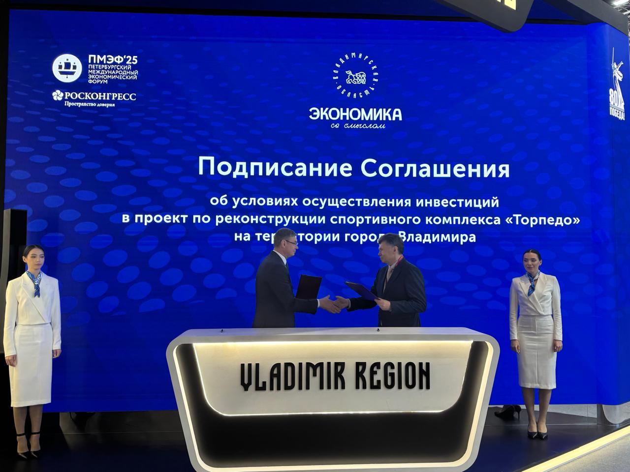 Сегодня, 18 июня 2025 года, «на полях» Петербургского международного экономического форума (ПМЭФ) заключено соглашение об условиях осуществления инвестиций в отношении проекта реконструкции крупнейшего спортивного комплекса «Торпедо» в городе Владимире между Правительством Владимирской области в лице губернатора Владимирской области А.А. Авдеева и ТРАНСПРОЕКТ Групп (АО) в лице Председателя Совета директоров В.В. Максимова. Подписание данного документа закрепляет намерения сторон по реконструкции легендарного спортивного объекта, имеющего богатую историю, начинающуюся с официального открытия стадиона в 1952 году, и являющегося важной частью спортивной инфраструктуры города Владимира через заключение концессионного соглашения, условия которого пока находятся на стадии проработки. Большая спортивная арена стадиона рассчитана на 18 тыс. посадочных мест, а стоимость данного проекта составляет порядка 5 млрд. рублей.